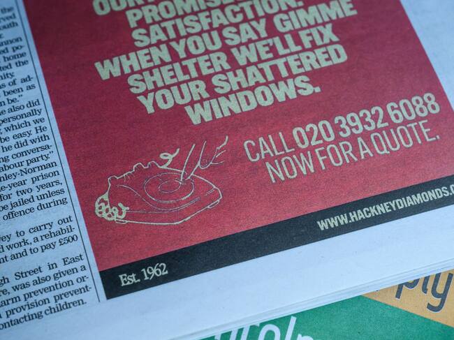 In this photo illustration, an advertisement for the «Hackney Diamonds Glass Repair» company is seen in a copy of the Hackney Gazette local free newspaper on August 23, 2023 in London, England. The Rolling Stones have hinted at the title of their upcoming 31st studio album, their first original work since 2005, through an advertisement for a fictional glass repair business in the Hackney Gazette. «Hackney Diamonds» is the local slang term for the pieces of shattered glass, found by the roadside. Leon Neal/Getty Images / Leon Neal