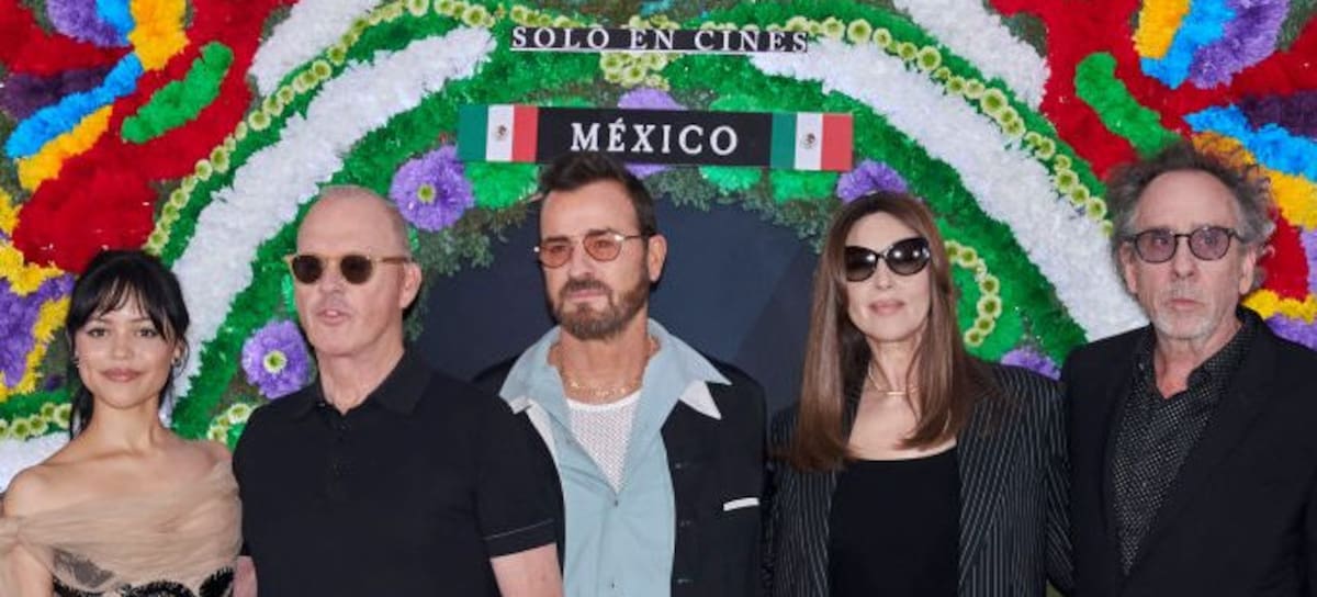 MEXICO CITY, MEXICO - AUGUST 13: (L-R) Jenna Ortega, Michael Keaton, Justin Theroux, Mónica Bellucci and Tim Burton pose during the photocall for the movie 'Beetlejuice Beetlejuice' at Four Seasons Hotel on August 13, 2024 in Mexico City, Mexico. (Photo by Jaime Nogales/Medios y Media/Getty Images)