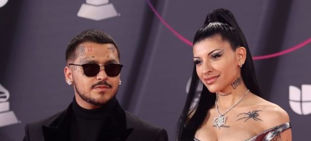 LAS VEGAS, NV - NOVEMBER 17: Christian Nodal (L) and Cazzu attend the red carpet during the 23rd Annual Latin GRAMMY Awards at Michelob ULTRA Arena on November 17, 2022 in Las Vegas, Nevada. (Photo by Omar Vega/FilmMagic)