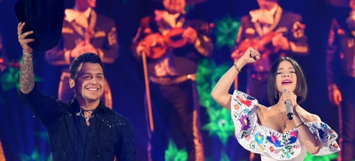 CORAL GABLES, FLORIDA - JULY 18: Christian Nodal, Angela Aguilar and Pipe Bueno perform on stage during Premios Juventud 2019 at Watsco Center on July 18, 2019 in Coral Gables, Florida. (Photo by Jason Koerner/Getty Images)