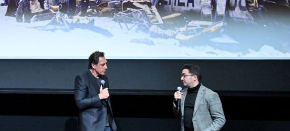 HOLLYWOOD, CALIFORNIA - JANUARY 08: (L-R) Javier Bardem and J.A. Bayona speak during Netflix's "Society of the Snow" Los Angeles Tastemaker screening at TUDUM Theater on January 08, 2024 in Hollywood, California. (Photo by Charley Gallay/Getty Images for Netflix)