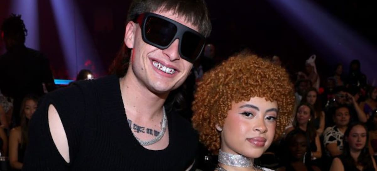NEWARK, NEW JERSEY - SEPTEMBER 12: (L-R) Peso Pluma and Ice Spice are seen during the 2023 MTV Video Music Awards at Prudential Center on September 12, 2023 in Newark, New Jersey. (Photo by Kevin Mazur/Getty Images for MTV)