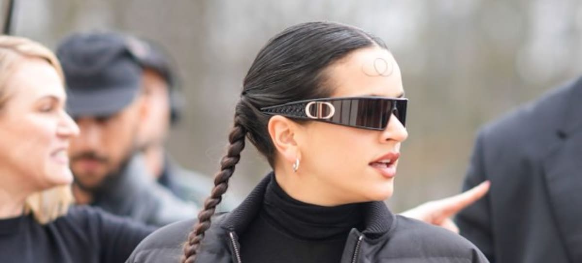 PARIS, FRANCE - FEBRUARY 27: Rosalia wears Dior sunglasses, earrings, a black turtleneck pullover , a black cropped winter puffer jacket , outside Dior, during the Womenswear Fall/Winter 2024/2025 as part of Paris Fashion Week on February 27, 2024 in Paris, France. (Photo by Edward Berthelot/Getty Images)