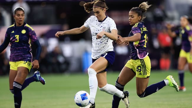 Alex Morgan #7 of the United States is defended by Jorelyn Carabali #19 of Colombia during the first half of the 2024 Concacaf W Gold Cup quarterfinal match at BMO Stadium on March 03, 2024 in Los Angeles, California. Carmen Mandato/USSF/Getty Images for USSF