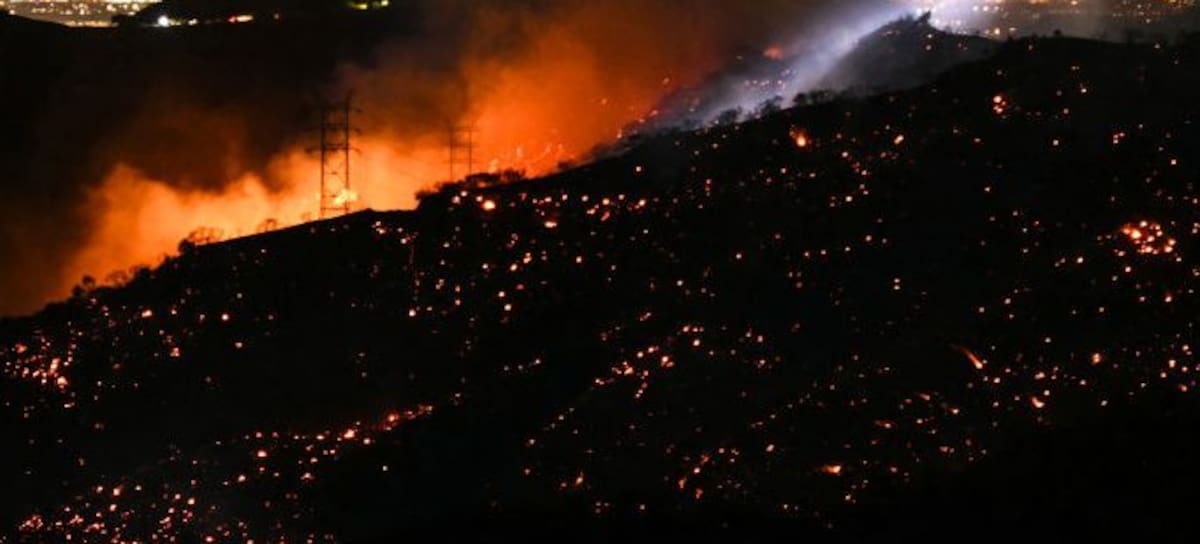 TOPSHOT - The light of a fire fighting helicopter illuminates a smouldering hillside as the Palisades fire grows near the Mandeville Canyon neighborhood and Encino, California, on January 11, 2025. The Palisades Fire, the largest of the Los Angeles fires, spread toward previously untouched neighborhoods January 11, forcing new evacuations and dimming hopes that the disaster was coming under control. Across the city, at least 11 people have died as multiple fires have ripped through residential areas since January 7, razing thousands of homes in destruction that US President Joe Biden likened to a "war scene." (Photo by Patrick T. Fallon / AFP) (Photo by PATRICK T. FALLON/AFP via Getty Images)