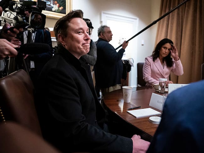 Elon Musk listens as President Donald J Trump speaks during a cabinet meeting at the White House on Thursday, April 10, 2025 in Washington, DC. Jabin Botsford/The Washington Post via Getty Images / The Washington Post