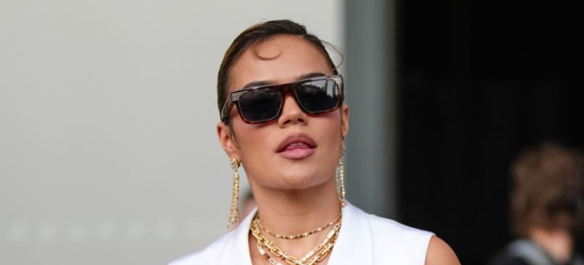 PARIS, FRANCE - JUNE 24: Karol G wears dark sunglasses and gold hoop earrings. The hair is styled back. A white textured sleeveless vest with a deep V-neck and button fastening is worn. Multiple layered gold necklaces are visible. The outfit includes white wide-leg trousers and a dark belt. A pink monogrammed handbag with brown leather handles and trim is carried. Footwear consists of white pointed shoes, outside Louis Vuitton, during Paris Fashion Week - Menswear Spring/Summer 2026, on June 24, 2025 in Paris, France (Photo by Edward Berthelot/Getty Images)