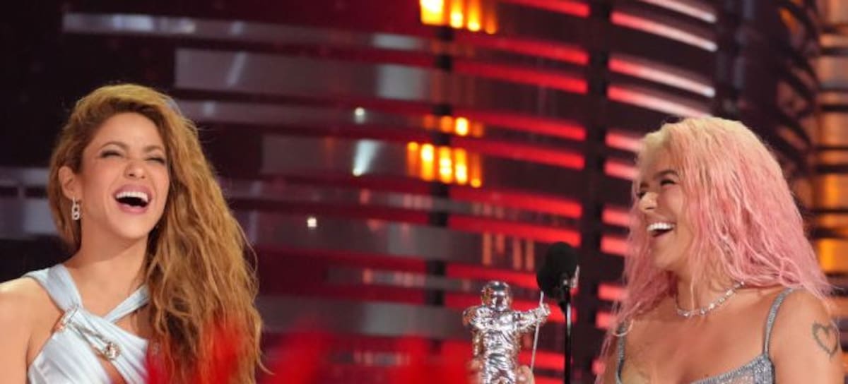 NEWARK, NUEVA JERSEY - 12 DE SEPTIEMBRE: (De izq. a der.) Shakira y Karol G aceptan el premio a la Mejor Colaboración por "TQG" en el escenario durante los MTV Video Music Awards 2023 en el Prudential Center el 12 de septiembre de 2023 en Newark, Nueva Jersey. (Foto de Jeff Kravitz/Getty Images para MTV)