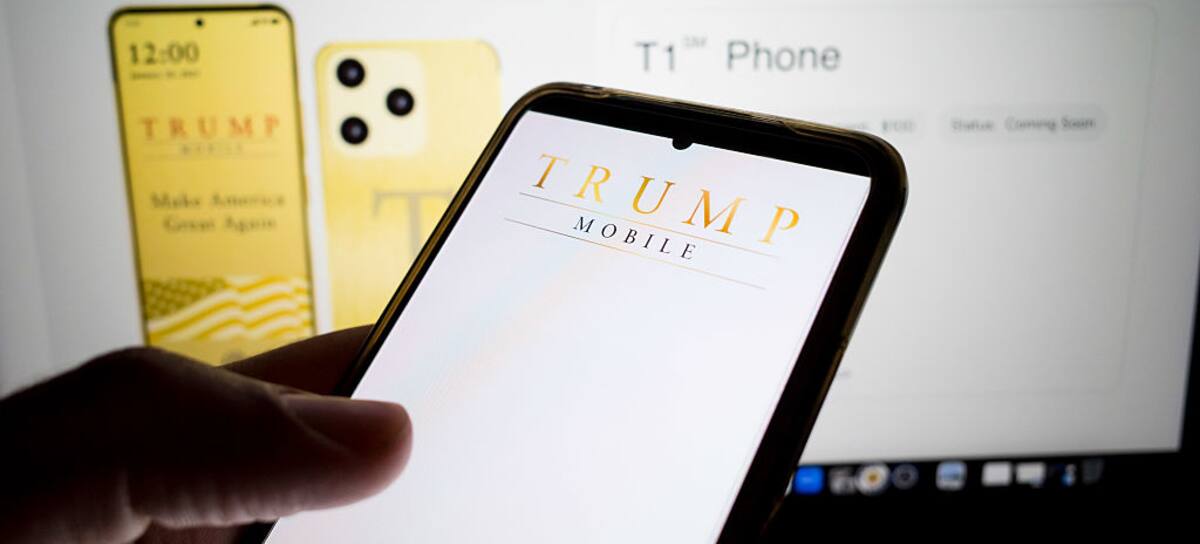 The Trump Mobile logo appears on a smartphone screen, and the website of Trump Mobile is on a laptop screen in the background, in this photo illustration in Athens, Greece, on June 17, 2025. (Photo by Nikolas Kokovlis/NurPhoto via Getty Images) / NurPhoto
