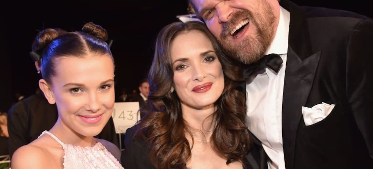 LOS ANGELES, CA - JANUARY 21: (L-R) Actors Millie Bobby Brown, Winona Ryder and David Harbour pose during the 24th Annual Screen Actors Guild Awards at The Shrine Auditorium on January 21, 2018 in Los Angeles, California. 27522_007 (Photo by Kevin Mazur/Getty Images for Turner)