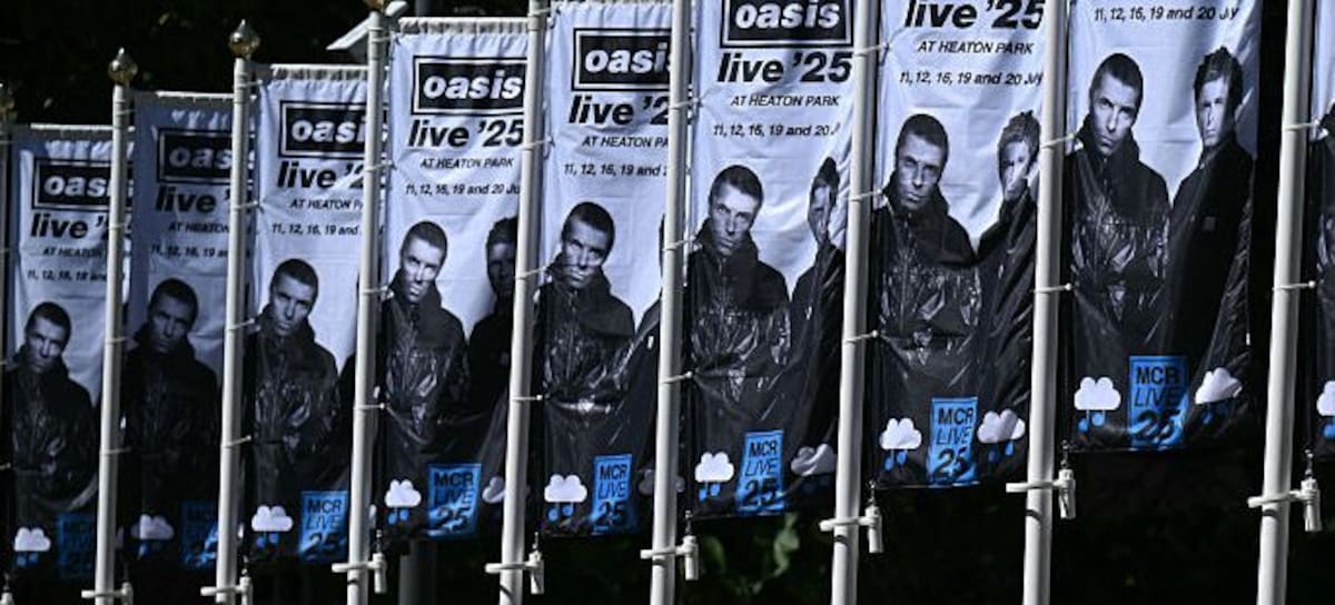 Flags advertising the second leg of British rock band Oasis's reunion tour at Heaton Park, are pictured in St Peter's Square, Manchester, northern England on July 11, 2025, ahead of the band's highly-anticipated reunion tour. The return of the prodigal Oasis brothers to Manchester Friday -- on the second leg of their highly-anticipated reunion tour -- has rekindled memories of the city's time as a cultural epicentre. Returning to their roots for five sold-out shows at the northwestern city's Heaton Park, the famous brothers have definitely created "a buzz around the place", said Susan O'Shea, music expert and senior lecturer in sociology at Manchester Metropolitan University. (Photo by Oli SCARFF / AFP) (Photo by OLI SCARFF/AFP via Getty Images)