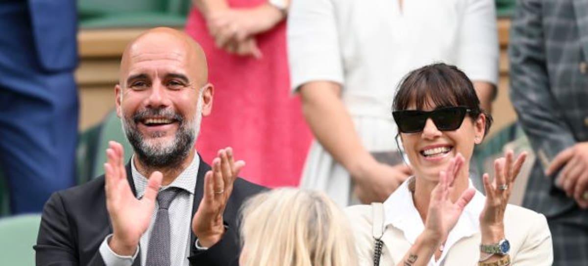 LONDON, ENGLAND - JULY 06: Maria Guardiola, Pep Guardiola and Cristina Serra attend day six of the Wimbledon Tennis Championships at the All England Lawn Tennis and Croquet Club on July 06, 2024 in London, England. (Photo by Karwai Tang/WireImage)