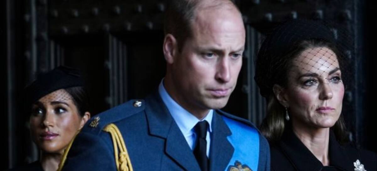 LONDON, ENGLAND - SEPTEMBER 14: Prince William, Prince of Wales, Catherine, Princess of Wales, Prince Harry, Duke of Sussex, and Meghan, Duchess of Sussex leave after escorting the coffin of Queen Elizabeth II to Westminster Hall from Buckingham Palace for her lying in state, on September 14, 2022 in London, United Kingdom. Queen Elizabeth II's coffin is taken in procession on a Gun Carriage of The King's Troop Royal Horse Artillery from Buckingham Palace to Westminster Hall where she will lay in state until the early morning of her funeral. Queen Elizabeth II died at Balmoral Castle in Scotland on September 8, 2022, and is succeeded by her eldest son, King Charles III. (Photo by Emilio Morenatti - WPA Pool/Getty Images)