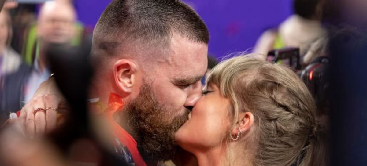 Football: Super Bowl LVIII: Kansas City Chiefs Travis Kelce (87) kisses girlfriend and singer Taylor Swift following victory vs San Francisco 49ers at Allegiant Stadium. (Erick W. Rasco/Getty Images)