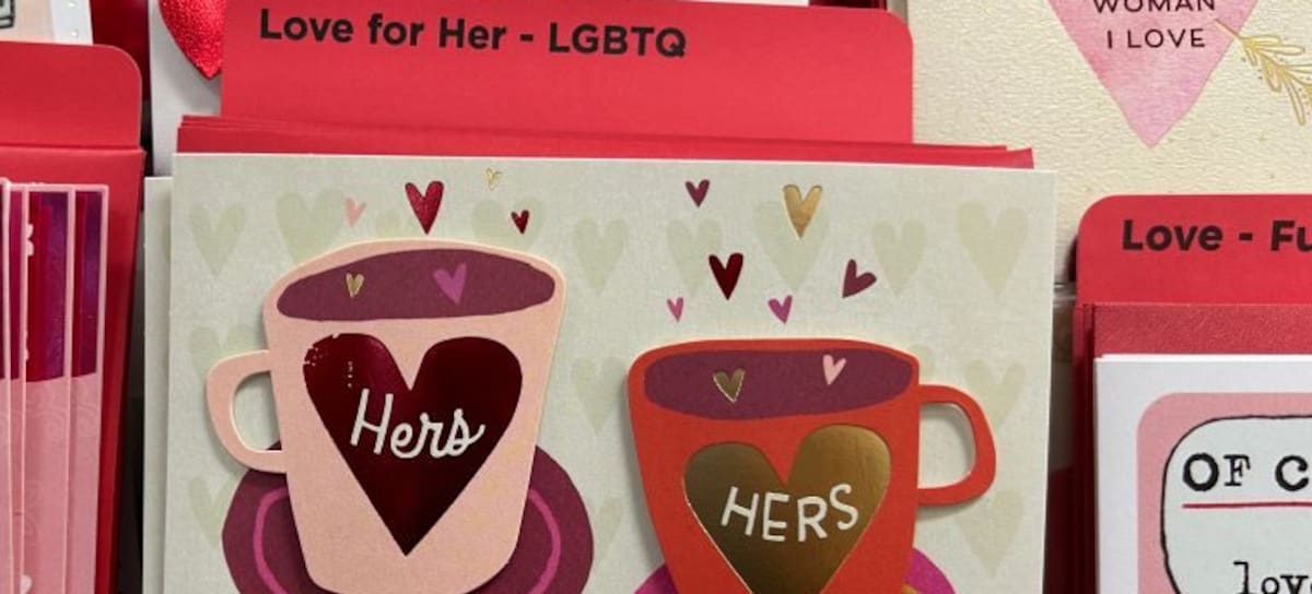 LGBTQA+ Valentines Day Card, Hers and Hers, on display in CVS pharmacy, Queens, New York. (Photo by: Lindsey Nicholson/UCG/Universal Images Group via Getty Images)