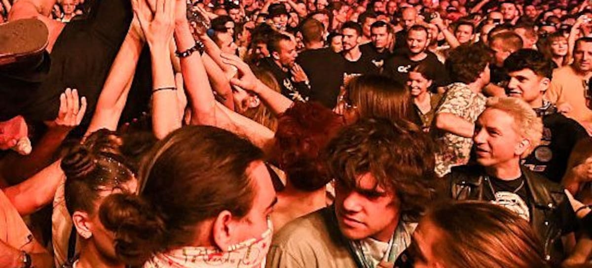 Festival-goers react during a concert at the Serbia's largest music festival "EXIT", in Novi Sad, on July 14, 2025. The curtain could fall on Serbia's biggest festival, held for 25 years in Novi Sad, "EXIT", a symbol of resistance to Slobodan Milosevic's regime and the fight against corruption in the country. Now, due to ongoing protests, public funding has suddenly disappeared, they say, and their partners have been "forced to withdraw" under pressure. (Photo by Nenad MIHAJLOVIC / AFP) (Photo by NENAD MIHAJLOVIC/AFP via Getty Images)