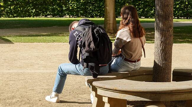 A young couple sits on a curved bench in a park, with the man leaning forward and holding his head while the woman sits upright beside him, in Prague, Czech Republic, on May 11, 2025. (Michael Nguyen/Getty Images)