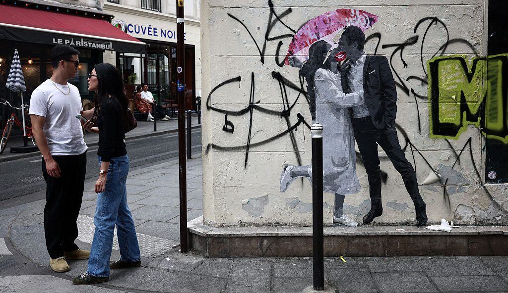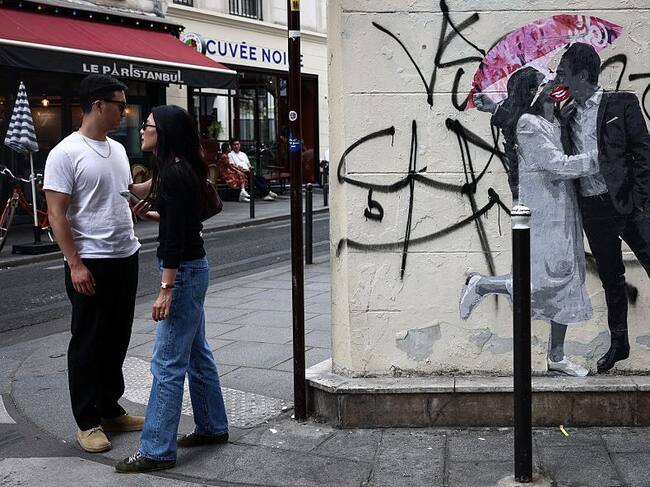 A couple stand near a street art graffiti in Paris on July 18, 2025. (Photo by Behrouz MEHRI / AFP) (Photo by BEHROUZ MEHRI/Getty Images)