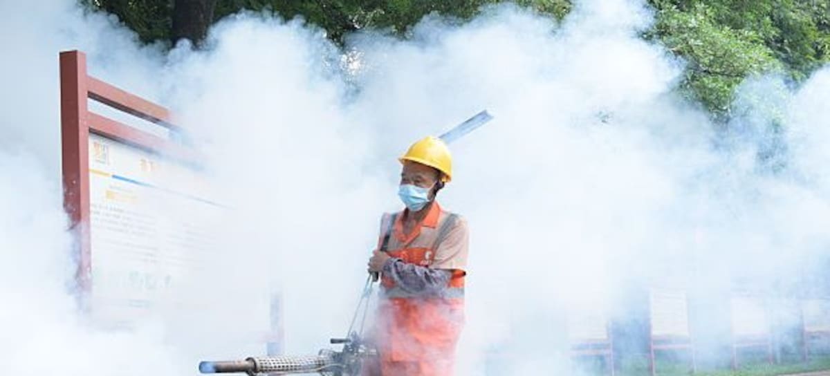 DONGGUAN, CHINA - AUGUST 03: A sanitation worker sprays insecticide to prevent the spread of Chikungunya on August 3, 2025 in Dongguan, Guangdong Province of China. China's Guangdong province has launched targeted measures, including citywide cleanup efforts, to effectively curb the spread of Chikungunya fever, a mosquito-borne viral disease. (Photo by VCG/VCG via Getty Images)