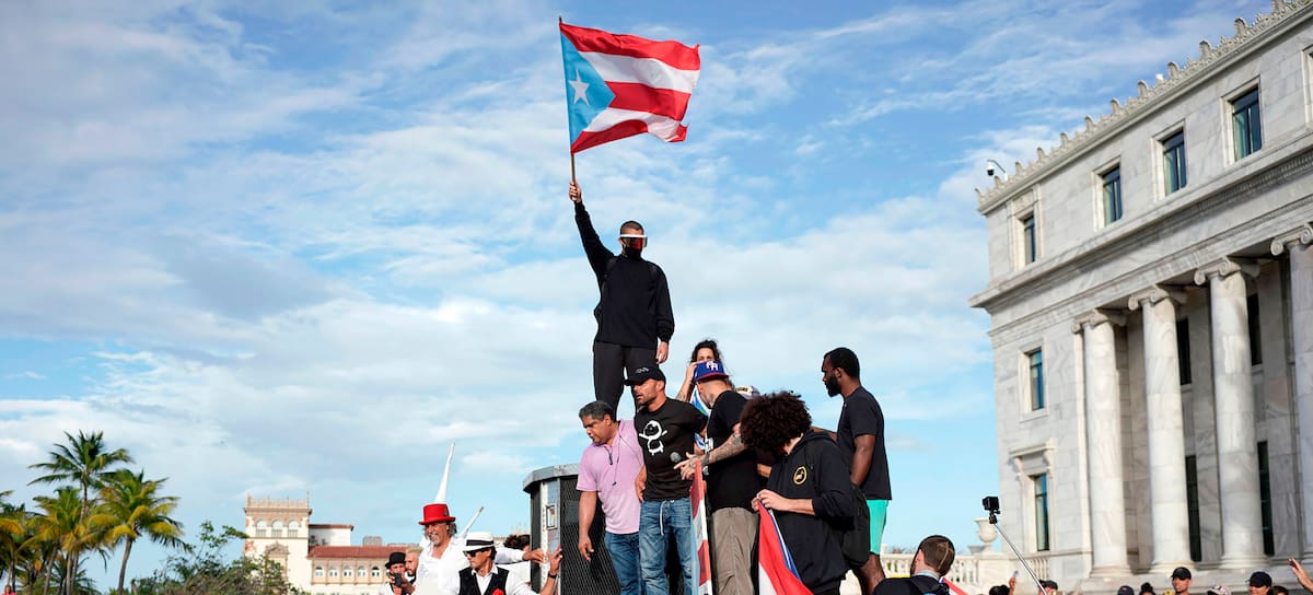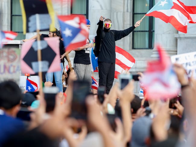 Bad Bunny and Residente at a protest in San Juan, Puerto Rico, demanding Governor Ricardo Rosselló’s resignation on July 17, 2019. / Jose Jimenez