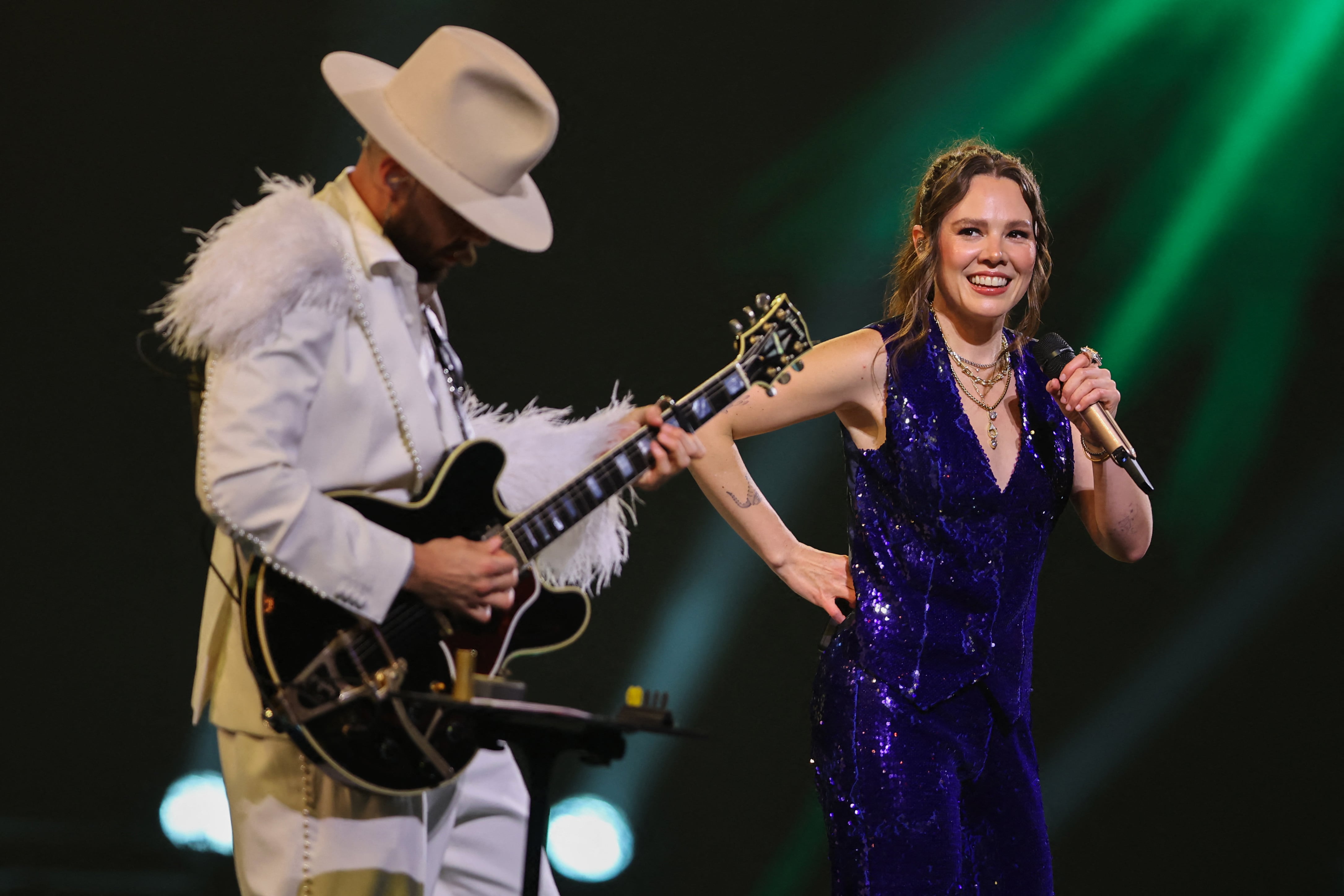 Los cantantes mexicanos Jesse Huerta (izq.) y Joy Huerta, del dúo pop Jesse & Joy, se presentan en el escenario durante la 65ª edición del Festival Internacional de la Canción de Viña del Mar en Viña del Mar, Chile, el 24 de febrero de 2026. / JAVIER TORRES
