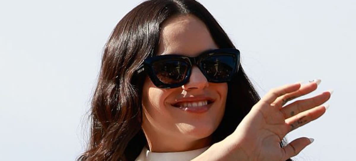 Rosalía is seen wearing white chiffon high-neck mini dress, black bow shoes and Dior black sunglasses outside Dior during the Womenswear Spring Summer 2026 as part of Paris Fashion Week on October 01, 2025 in Paris, France. (Photo by Hanna Lassen/Getty Images)